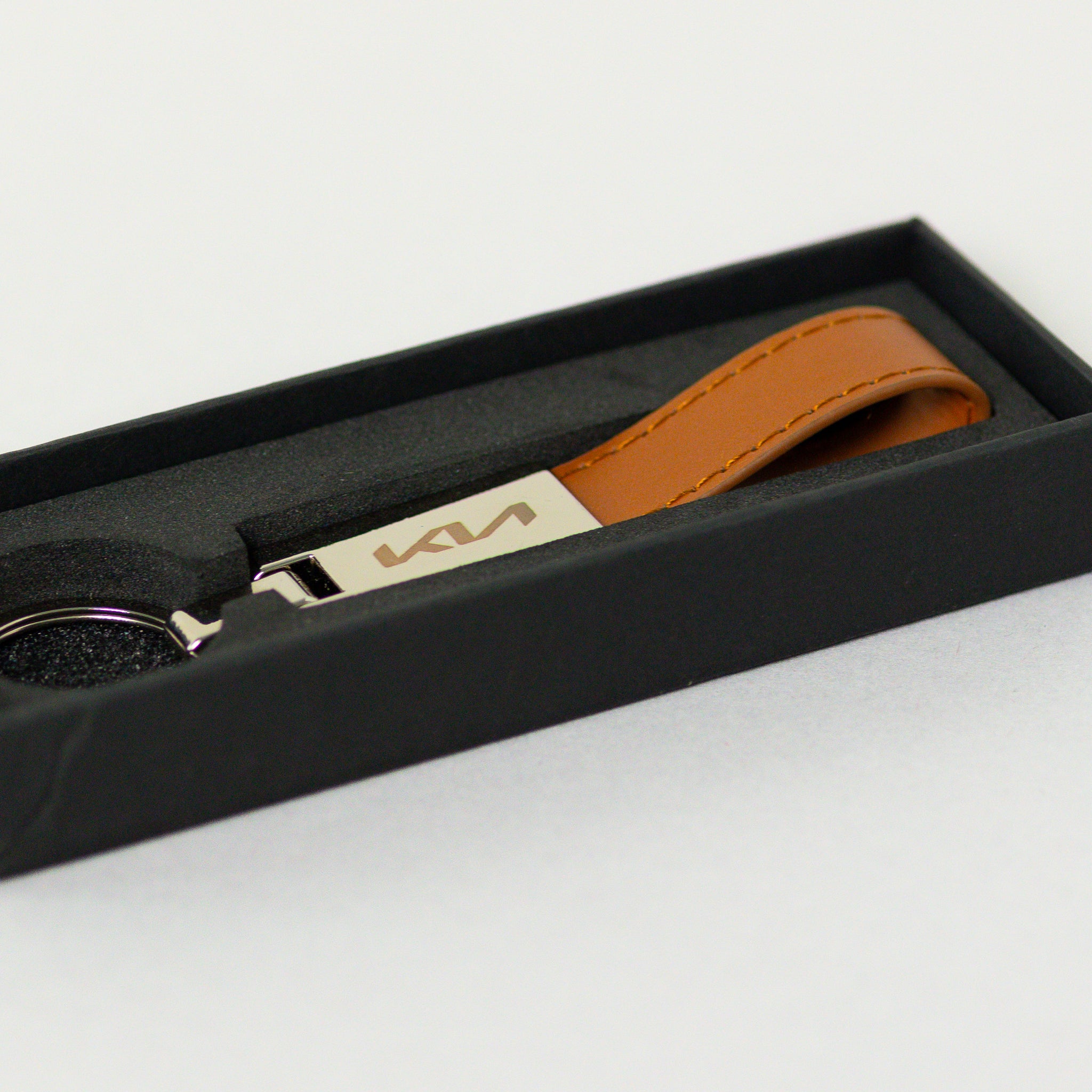 Diseño sofisticado que refleja la calidad de la marca Kia. Duradero para uso diario, ligero y compacto. El acabado pulido del acero inoxidable grabado con láser contrasta perfectamente con la textura del cuero negro, creando un accesorio moderno y funcional para sus llaves.